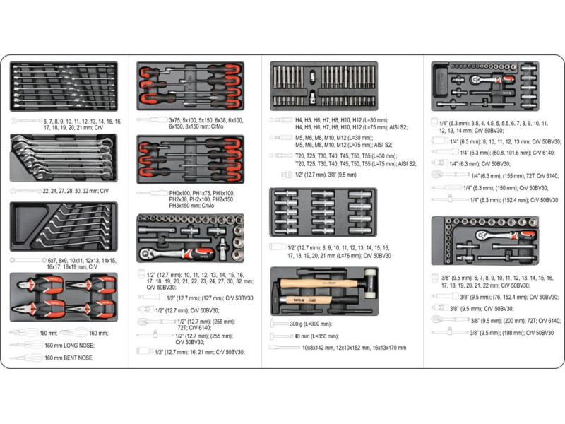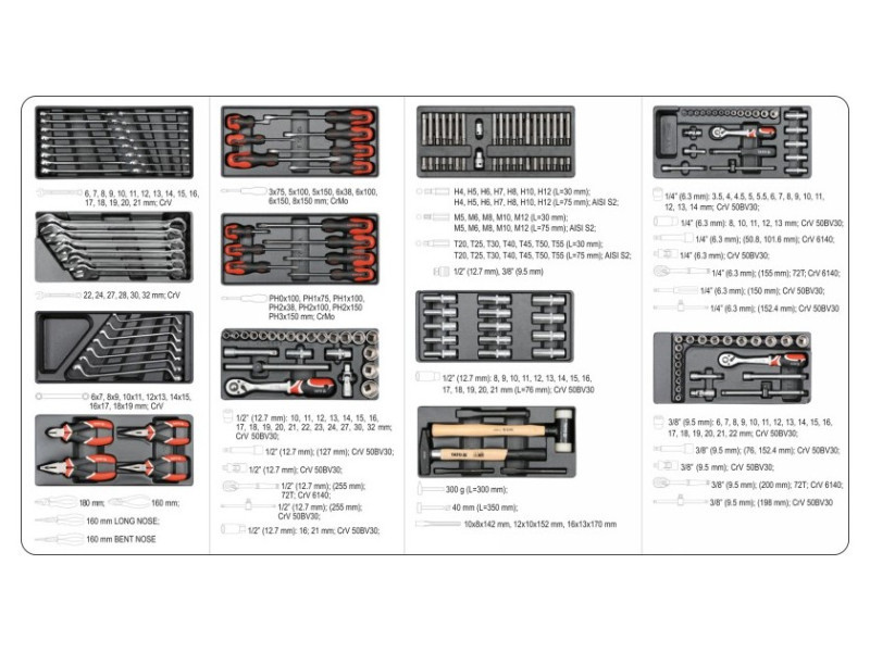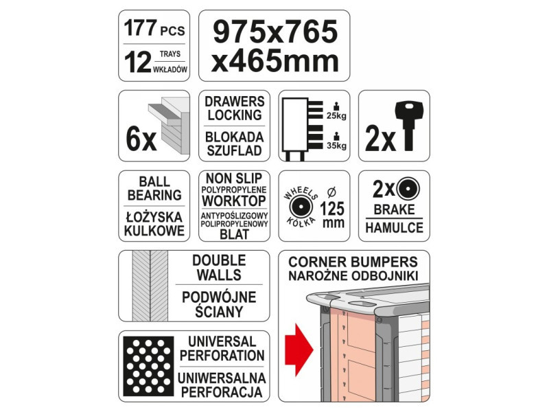 A készletben 12 cserélhető YATO szerszámbetét található, amelyek összesen 177 precízen válogatott szerszámot tartalmaznak. A biztonság érdekében a kocsi központi zárral (2 kulccsal) és minden fiókhoz tartozó egyedi zárral van felszerelve. A kétszeres lemezből készült profilok és a dupla falú kialakítás nagy szilárdságot és hosszú élettartamot garantálnak.
