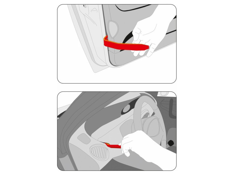 Az ék alakú, elvékonyodó fejformák könnyedén becsúsznak a kárpit alá, míg az élénk színű kialakítás segít a szerszámok gyors megtalálásában sötétebb helyeken is. A puha anyag nem karcolja a lakkozott felületeket, így megőrzi az autó belső esztétikáját. A készletet egy praktikus fali vászontartóban szállítják, amely megkönnyíti a tárolást és rendszerezést.