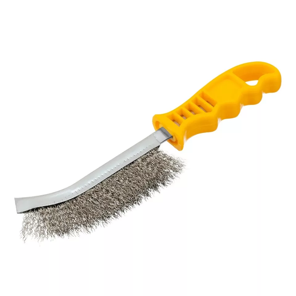 Ez a rozsdamentes acél sörtékkel ellátott drótkefe ideális rozsda, szennyeződés és festékmaradványok eltávolítására fém, fa és egyéb felületekről.