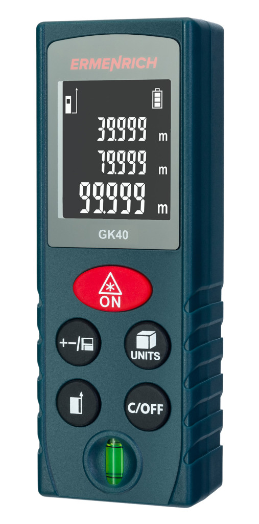 Az Ermenrich Reel PLUS GK40 lézeres mérő számos építőipari, javítási, mérnöki és háztartási feladat megoldásához használható. Lehetővé teszi pontos mérések végzését 40 méteren belül, illetve a térfogat és a terület kiszámítását. Nehéz körülmények közötti mérésekhez – amikor nem lehet a mérőműszert megfelelően elhelyezni – ott van a Pitagorasz-tétel funkció: közvetett mérésekkel segít kiszámítani a kívánt pontig való távolságot. A készülék vízmértékkel is rendelkezik, amely használható a mérőműszer pontos elhelyezéséhez, de külön szerszámként is.