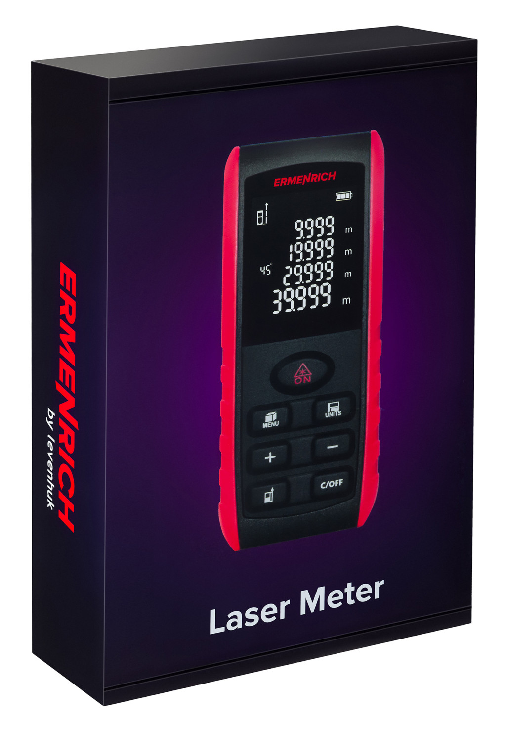 Az Ermenrich Reel PRO GE100 lézeres mérő egy kompakt műszer, különböző építőipari, javítási és mindennapi feladatokban való használatra. Segítségével 2 milliméteres pontossággal meg lehet határozni két pont közötti távolságot, továbbá kiszámítható vele a terület és a térfogat, illetve meg lehet mérni egyes objektumok szögét. A mérőműszer emellett Pitagorasz-tétel funkcióval is rendelkezik – a távolságokat köztes mérések segítségével is ki tudja számítani. Ez akkor lehet praktikus, ha a mérőműszert nem lehet a kívánt ponton elhelyezni, vagy ha a sugár útjában akadály van.