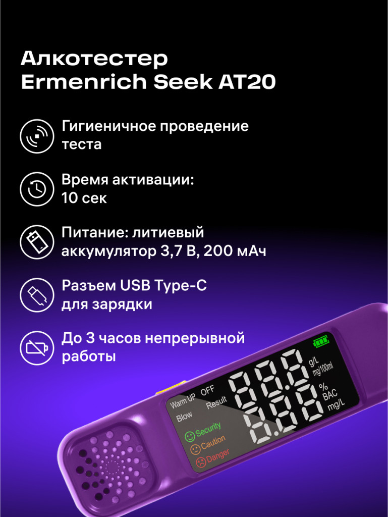 Az érintésmentes érzékelővel ellátott Ermenrich Seek AT20 alkohol-tesztelő a véralkoholszint meghatározására szolgál – akár önellenőrzés céljából, akár szakértői vizsgálat részeként. A mérési tartomány 0–0,19% BAC (véralkohol-koncentráció, azaz a kilélegzett levegőből meghatározott alkoholkoncentráció a vérben) vagy 0–1,9 g/l. A teszt elvégzése akkor megfelelő, ha a kilégzés legalább 10 másodpercig tart.