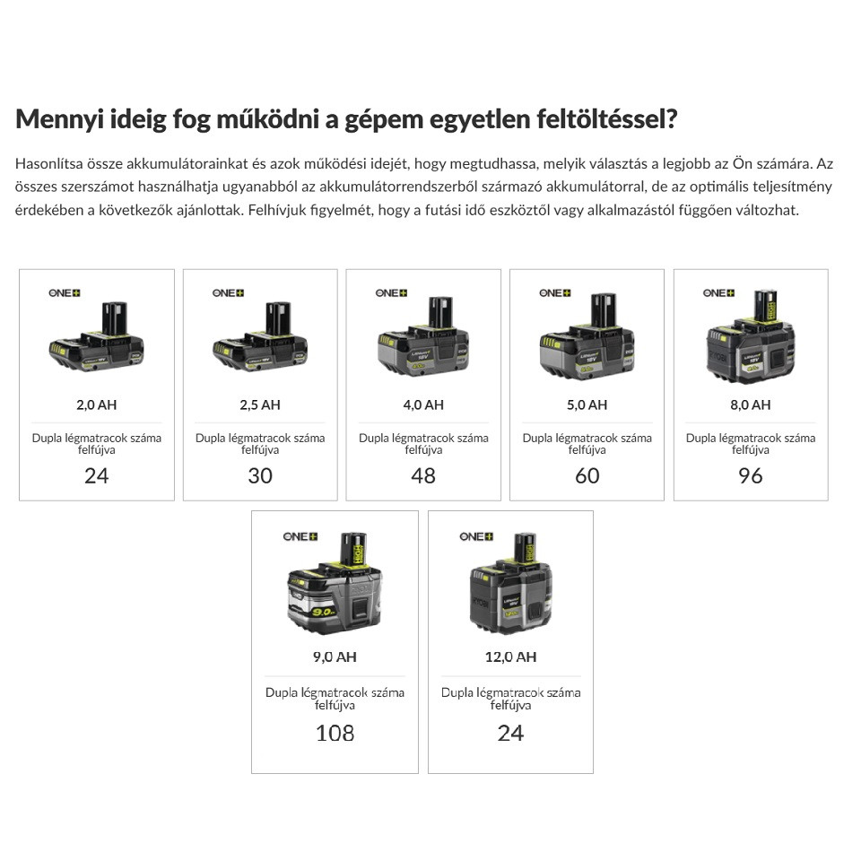 Kompatibilitás RYOBI ONE+™ akkumulátorok