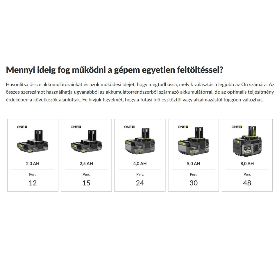 A készülék SOLO kivitelben érkezik, tehát akkumulátort és töltőt nem tartalmaz, de teljes mértékben kompatibilis a RYOBI 18V ONE+ rendszerrel, így meglévő akkumulátorokkal is használható.