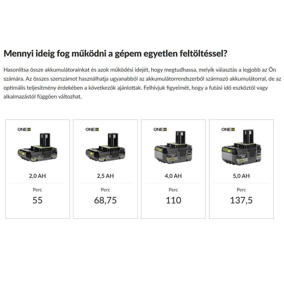 A készülék kompatibilis a RYOBI 18V ONE+ rendszerrel, így a meglévő akkumulátorokkal is használható.
