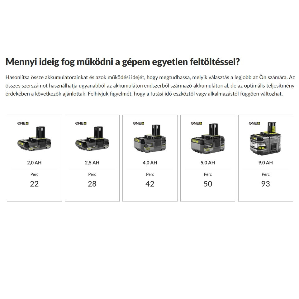 A készülék SOLO kivitelben kapható, tehát akkumulátort és töltőt nem tartalmaz, de kompatibilis a RYOBI 18V ONE+ rendszerrel, így bármely meglévő 18V-os RYOBI akkumulátorral használható.