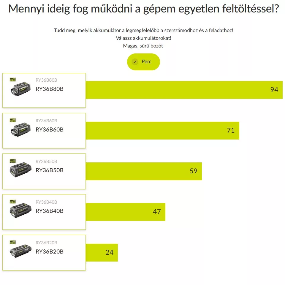 A szett 1 db 4.0Ah Li-ion akkumulátort és RY36C17A töltőt tartalmaz, így azonnal használatra kész, és természetesen kompatibilis az összes RYOBI 36V MAX POWER rendszerű kerti géppel.