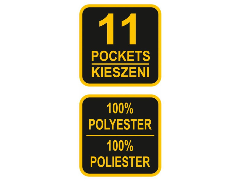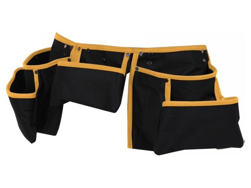 Az övtáska 11 praktikus zsebbel rendelkezik, valamint 2 fémből készült kalapácstartóval, így minden fontos eszköz kéznél van. Az állítható hosszúságú szállítópánt kényelmes viseletet garantál, a műanyag csat pedig stabil rögzítést biztosít. A sárga-fekete színű kialakítás jól látható és modern megjelenést kölcsönöz.