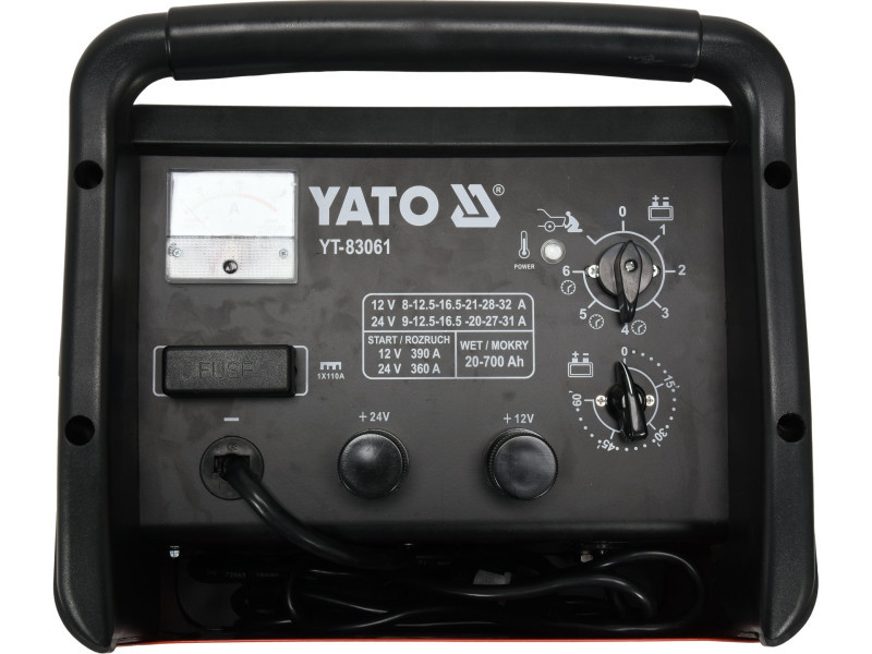 A YATO YT-83061 egy professzionális akkumulátor töltő és indítóállomás, amelyet 12 V és 24 V feszültségű akkumulátorokhoz terveztek. Ideális választás autók, furgonok, teherautók és mezőgazdasági gépek számára. A gumírozott ház és az indítást támogató funkció biztosítja a biztonságos és hatékony használatot. A készülék akár 700 Ah kapacitású akkumulátorokat is képes tölteni, míg az indítási áram eléri a 390 A-t (12 V) és 360 A-t (24 V).