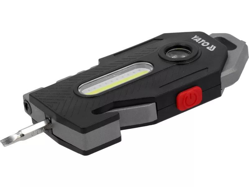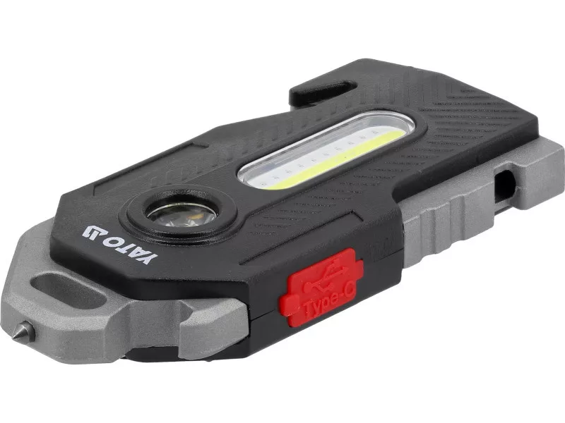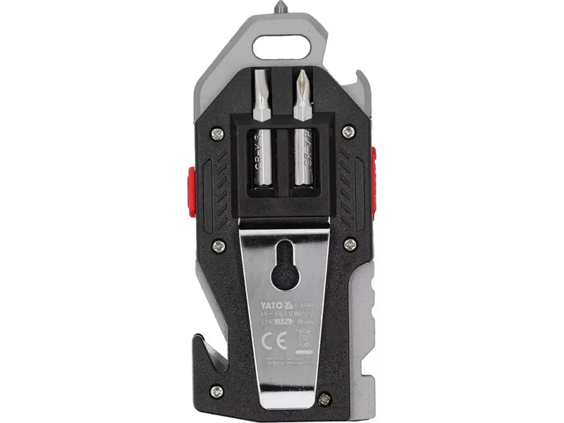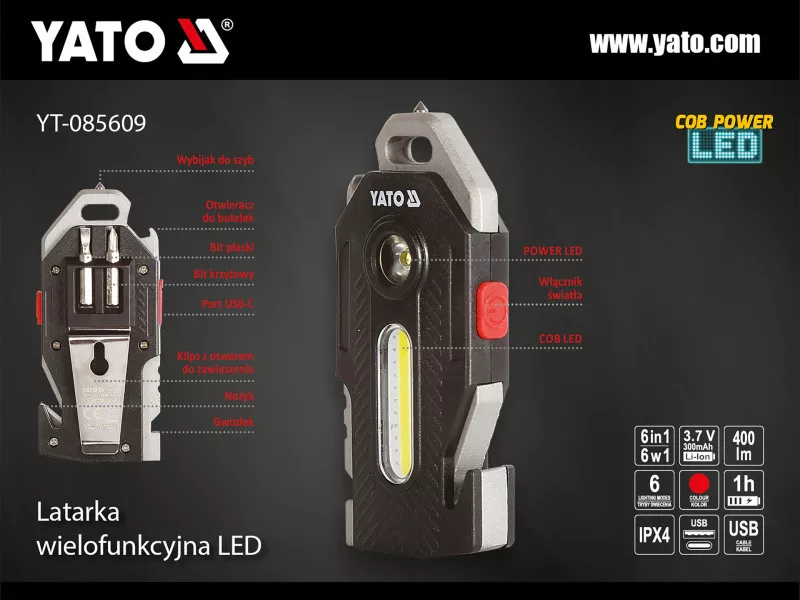 Egy kis többfunkciós zseblámpa kétféle LED-del és világítással, hat móddal, hogy a világítást a körülményekhez és tevékenységekhez igazítsa. A tokban elhelyezett további elemek mindennapi tevékenységek és szabadban végzett tevékenységek során jól jöhetnek.    6 az 1-ben funkciók:  zseblámpa 6 működési móddal  Tűzdelő  kés, például övekhez Csavarhúzó 2 bit - lapos és kereszt alakú   fütty  Üvegnyitó  Világítás forrása: 3 W POWER LED-ek és 2 W COB LED-ek 6 világítási mód: 400 lm (LED turbo), 200 lm (LED nagy), 50 lm (LED alacsony), 120 lm (COB nagy), 35 lm (COB alacsony), piros-kék villogó fény max. munkatávolság 18 m (POWER LED), 10 m (COB) élettartam: 50000 óra Energiaforrás: Akkumulátor: Li-Ion 3.7 V 300 mAh (402040 típus) működési idő: 30 s (turbo), 1,5 óra (nagy), 2,5 óra (alacsony) töltési idő: 1 óra kábel: USB-C Konstrukció és jellemzők: vízálló: IPX4 fény színe: 6000-7000K CRI: 70  ki-/bekapcsoló gomb - bekapcsolja a zseblámpát, módokat vált. A gomb lenyomva tartásával egy rendkívül erős fény aktiválódik turbó módban (400 lm), ami automatikusan nagy módba vált (200 lm) 30 másodperc után, energiát spórolva   anyag: alumínium és ABS csipesz ruhához történő rögzítéshez egy további lyuk lehetővé teszi, hogy a zseblámpát egy csavarra akasszuk és reflektorként használjuk  súly: 63 g (akkumulátorral együtt) méretek: 99 x 38 x 18 mm