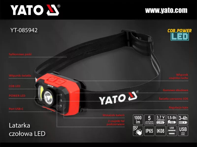 Egy nagyon erős, újratölthető fejlámpa, beépített mozgásérzékelővel, amely lehetővé teszi a fény be- és kikapcsolását a kéz intésével. Tökéletes aktivitáshoz, sportoláshoz és éjszakai vagy sötét körülmények közötti munkavégzéshez. A kézmozgás általi szenzoraktiválás hasznos lehet piszkos kézzel, kesztyűben végzett munka vagy a kapcsoló aktiválása nélküli munkavégzés során is. Hét működési mód teszi lehetővé a világítás igazítását a tevékenységekhez és az akkumulátor szintjéhez, akár 9 órán át tartó világítást biztosítva. Két típusú LED segítségével beállítható a megvilágítandó terület - a fényt fókuszálhatja vagy szórhatja, optimális látási körülményeket biztosítva. A fejlámpa akár 1000 lm fényáramot bocsát ki, és akár 132 m hatótávolságú. Fényforrás: 1 W COB LED és 8 W POWER LED 5 alapvető világítási mód: COB 100%, COB 50%, POWER 100%, POWER 50%, POWER 10%  2 további fény mód: pulzáló és piros SOS fény lumenek száma: 100 lm (100% COB LED), 50 lm (50% COB LED), 1000 lm (100% POWER LED), 500 lm (50% POWER LED), 100 lm (30% POWER LED) munkahatótávolság: 132 m (POWER LED), 12 m (COB LED)   Energiaforrás: Li-Po 1200 mAh, 3.7 V d.c. akkumulátor működési idő: 9 óra (30%), 3 óra (50%), 1,5 óra (100%) töltési idő: 3-4 óra akkumulátor töltöttségjelző élettartam: 100000 óra C típusú akkumulátortöltő Konstrukció és jellemzők: mozgásérzékelő, mely kézmozgásra aktiválódik kapcsoló vízálló: IP65 mechanikus szilárdság: IK08 fény színe: 6000-7000K CRI: >70 elasztikus pánt karcolás-, ütés-, horpadás- és vegyszerálló ABS anyag  súly: 89g méretek: 64.5 × 43.3 × 40 mm IP65 - védettség a por és a vízsugár ellen, amelyet a ház bármely oldaláról ráöntenek (12,5 l/perc). IK08 - 2J ütésállóság. CRI - színhőmérséklet mutató, amely 0-tól 100-ig terjed - minél magasabb a paraméter, annál jobb a színvisszaadás és a természetes megjelenés. ABS – jellemzője a nagyon magas karcolás-, ütés- és horpadásállóság, valamint a különböző vegyi anyagok hatásainak ellenállás. Használati figyelmeztetések: Figyelem. Szemkárosodás veszélye. Ne irányítsa a fénysugarat a szembe! Komoly látásproblémákat okozhat.