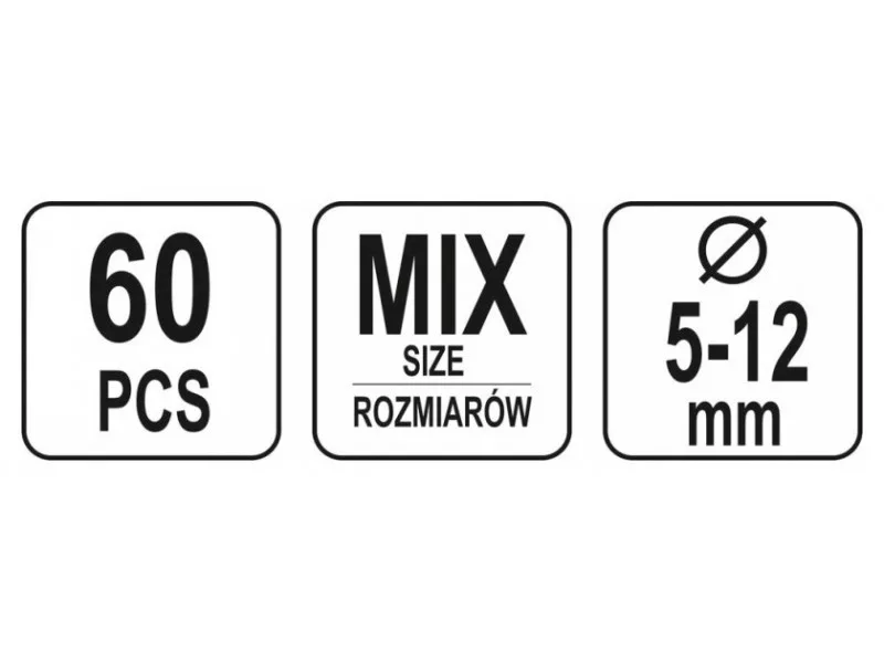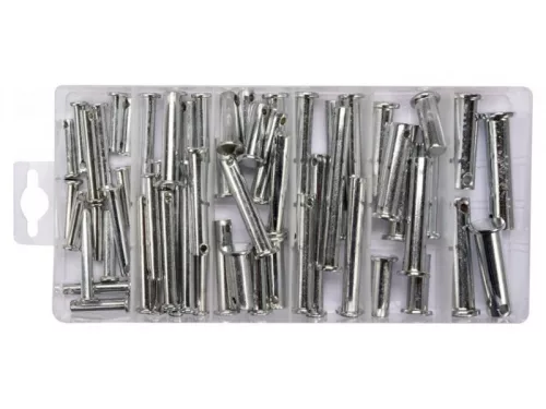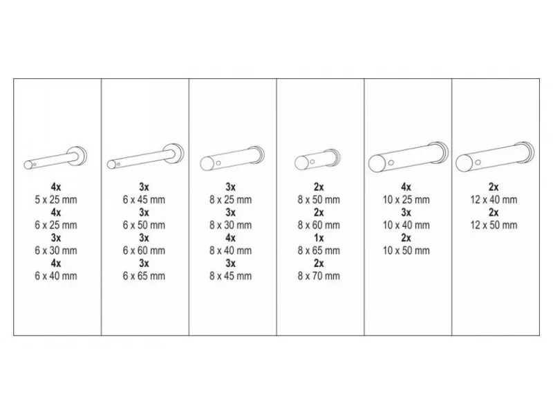 60 darabos fejjel és lyukkal ellátott csapszett. A készletben található méretek 5x25 mm-től 12x50 mm-ig. Az egész egy kényelmes "válogató" csomagolásban található.