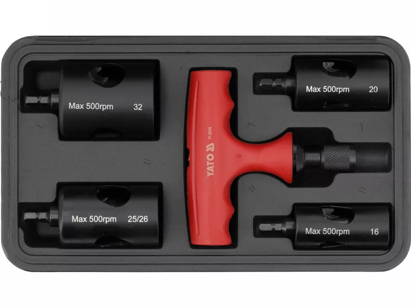 A YATO YT‑22370 csősorjázó készlet ideális választás műanyag és fém csövek belső és külső sorjáinak gyors, tiszta eltávolításához. A 16–32 mm-es tartomány lefedi a leggyakoribb víz-, fűtés- és szerelési méreteket, így szerelőknek és karbantartóknak egyaránt praktikus eszköz. A masszív kialakítás és az ergonomikus fogás biztosítja a hatékony munkavégzést, a koffer pedig rendezetten és biztonságosan tárolja az egész készletet.