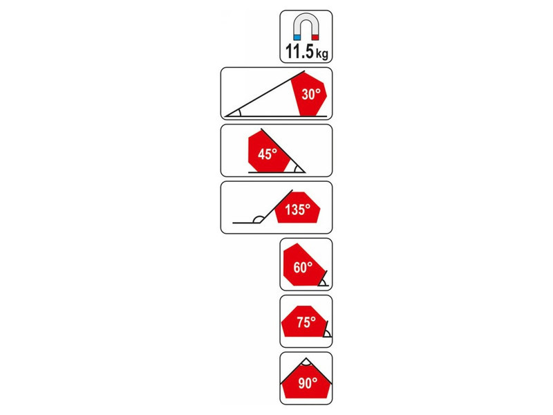 Ez a mágneses tartó acéllemezből és ferritmágnesekből készült, így megbízhatóan tartja a munkadarabot a beállított szögben. A hatféle szögbeállítás (30°, 45°, 60°, 75°, 90°, 135°) lehetővé teszi, hogy rugalmasan alkalmazkodj a feladathoz, legyen szó lemezről, szögvasról vagy laposacélról.