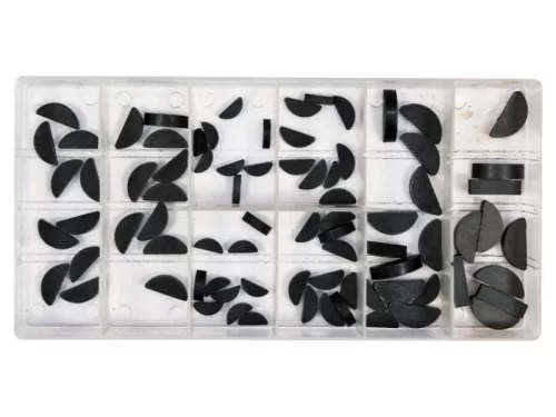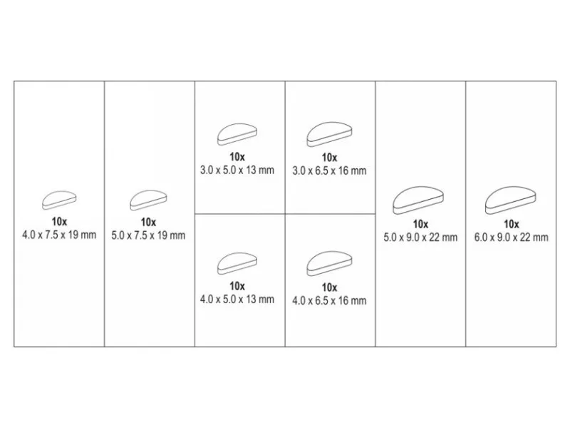 Egy 80 darabos félkörű szegélyekből álló készlet. Mindez egy kényelmes 3*5*13 mm rendezőben: 10db; 3*6.5*16 mm: 10db; 4*5*13 mm: 10db; 4*6.5*16 mm; 10db; 4*7.5*19 mm: 10db; 5*7.5*19 mm: 10db; 5*9*22 mm: 10db; 6*9*22 mm: 10db;