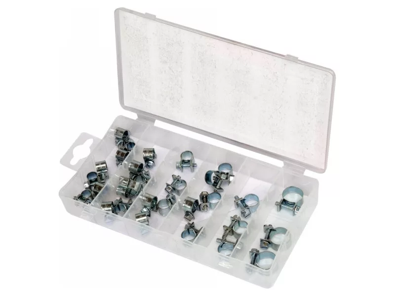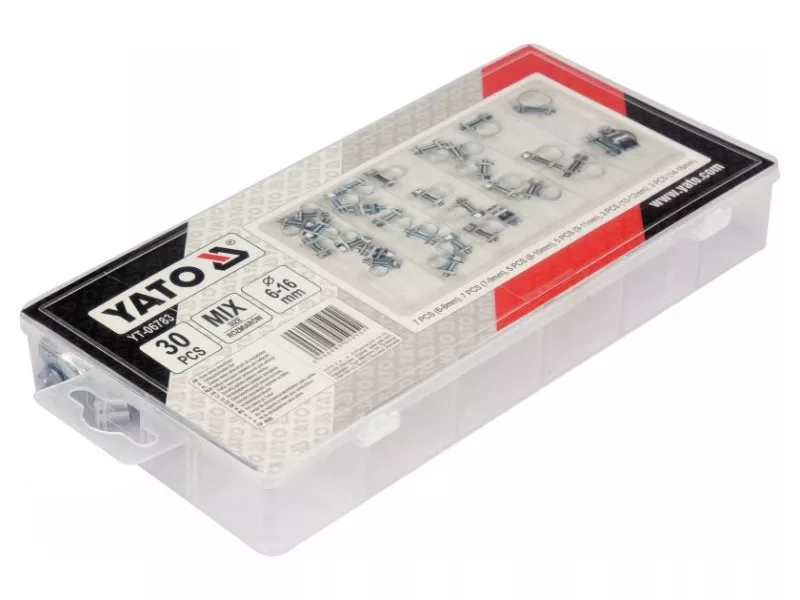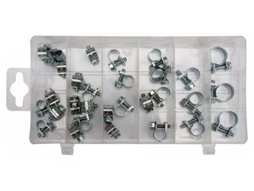Csavaros tömlőcsipesz készlet, melyet autós és mechanikai szolgáltatásokhoz ajánlunk.Csipeszek:7 db. 6-8 mm7 db. 7-9 mm5 db. 8-10 mm5 db. 9-11 mm3 db. 10-12 mm3 db. 14-16 mmPraktikus műanyag dobozban csomagolva