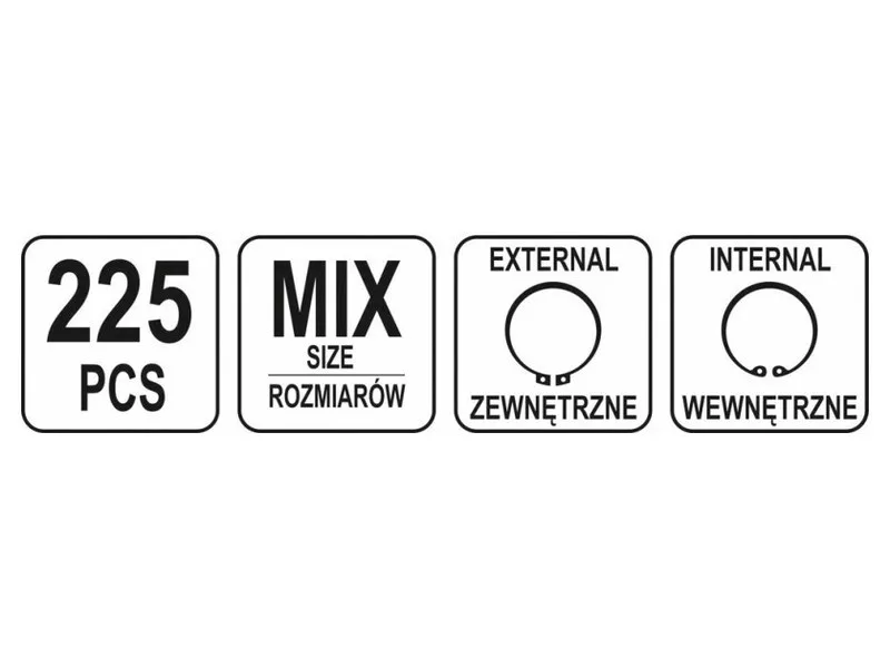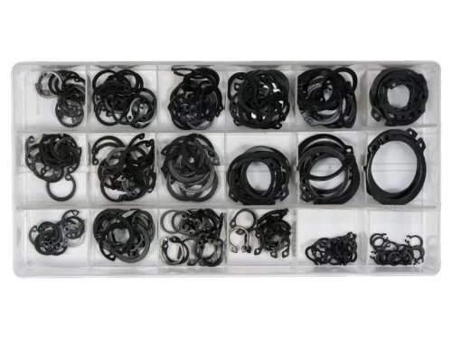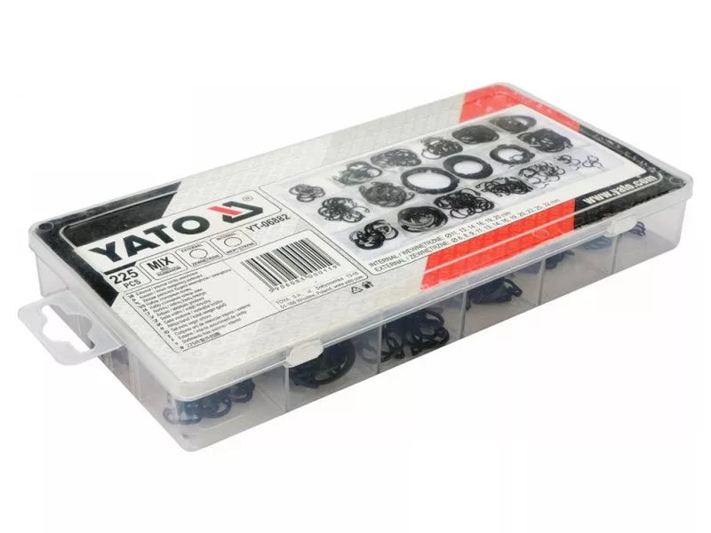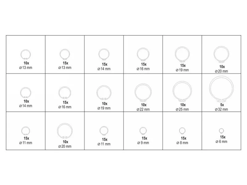 225 darabos külső és belső segergyűrű készlet. A készlet méretei 6 mm-től 32 mm-ig terjednek. Az egész egy kényelmes "válogató" csomagolásban helyezkedik el.