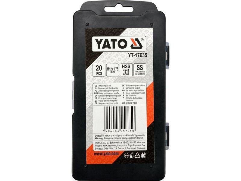 A YATO YT-17635 egy professzionális spirális menetjavító készlet, amelyet kifejezetten M12 × 1.75 mm-es sérült menetek helyreállítására terveztek. A készlet elemei strapabíró rozsdamentes acélból és HSS gyorsacélból készültek, így hosszú élettartamot és precíz munkavégzést biztosítanak.